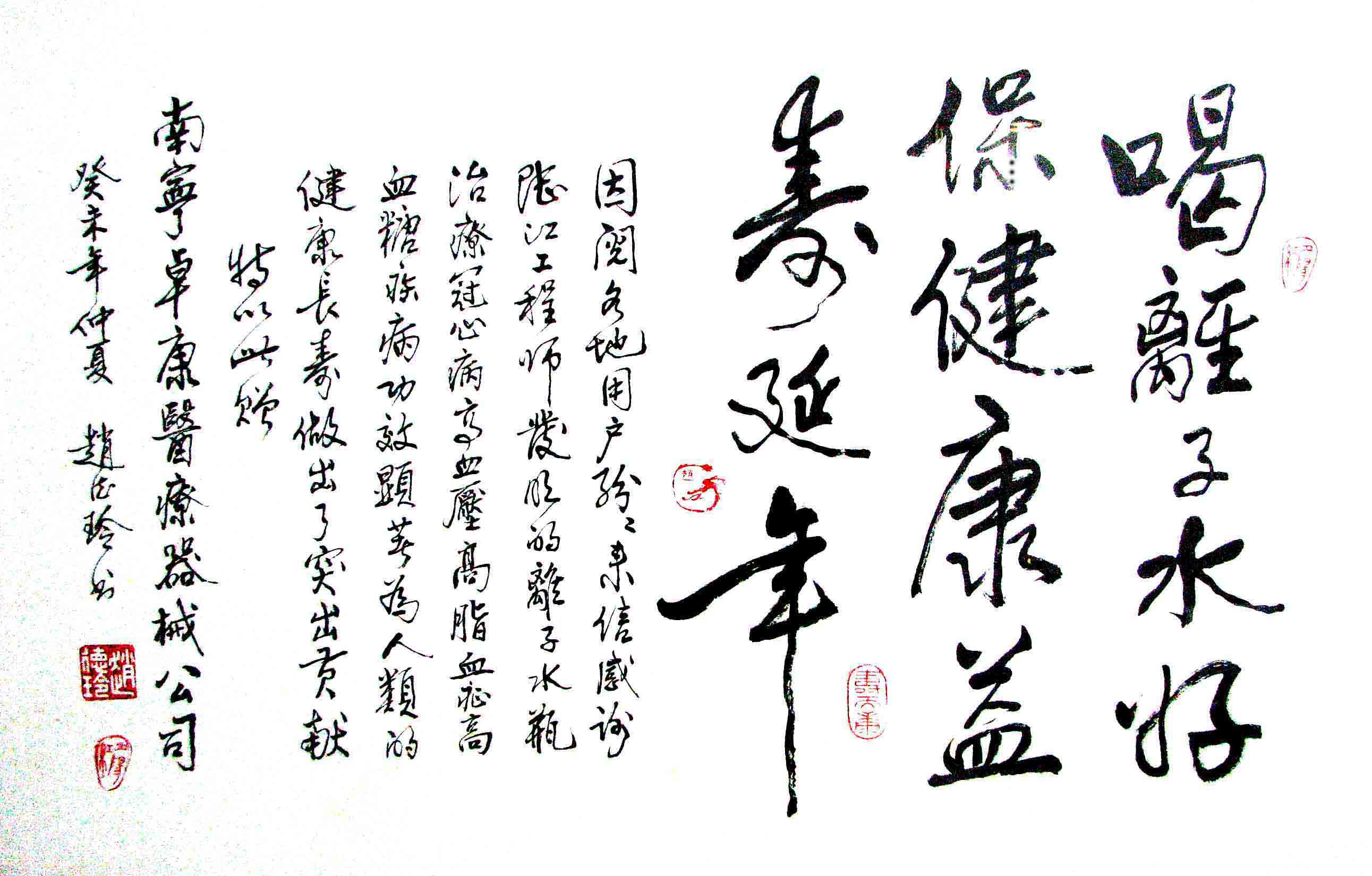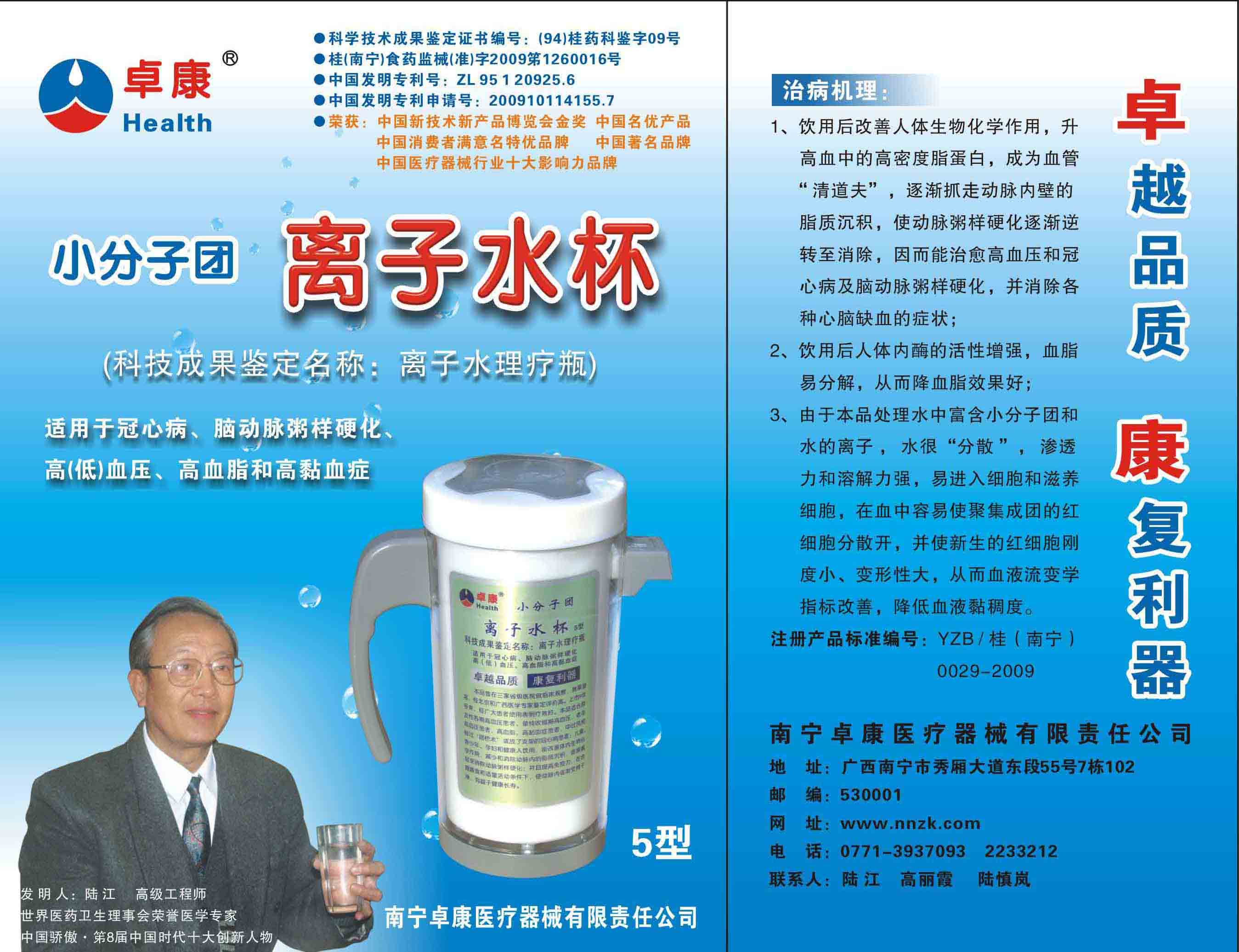 - -----南寧卓康微小水科技有限公司原為南寧卓康醫(yī)療器械有限責(zé)任公司 ,用戶普遍反饋高血壓患者飲用2—5個(gè)月,癥狀消除,不再服藥,治愈了高血壓; 冠心病患者,包括已做和未做支架或搭撟手術(shù)者,經(jīng)3—5個(gè)月飲用,消除心痛、胸悶、早搏、房顫和心絞痛等癥狀,逆轉(zhuǎn)至消除動(dòng)脈粥樣硬化和斑塊,一年左右治愈冠心病,心腦電圖正常,經(jīng)冠脈造影掃描無明顯狹窄,表明冠心病痊愈;糖尿病人飲用3-10個(gè)月,血糖尿糖正常,治愈2型糖尿病; 并且使前列腺增生、低血壓、腦萎慢性咽喉炎、慢性氣管炎、支氣管炎、哮喘、矽肺病、甲亢、慢性胃腸炎、膽囊炎、慢性腎炎、腎衰、風(fēng)濕性關(guān)節(jié)炎、痔瘡和濕疹皮炎及中風(fēng)癱瘓或偏癱失語(yǔ)后遺癥等不藥而愈,且多病同治,無需終生服藥,彌補(bǔ)了幾千年來藥物的欠缺,使“微小水”成為人類消除高血壓、冠心病和糖尿病的寶貴資源。腦動(dòng)脈粥樣硬化、低血壓和前列腺增生患者,一般飲用四個(gè)月痊愈;中風(fēng)后遺癥患者,一般飲用8個(gè)月痊愈。請(qǐng)?jiān)旈啞队脩舴答仭窓谀恐写罅炕颊叩姆答佇拧z測(cè)報(bào)告,有的還附照片。產(chǎn)品屢獲大獎(jiǎng),論文也屢獲一等獎(jiǎng)。廣大用戶好評(píng)不斷,有口皆碑。